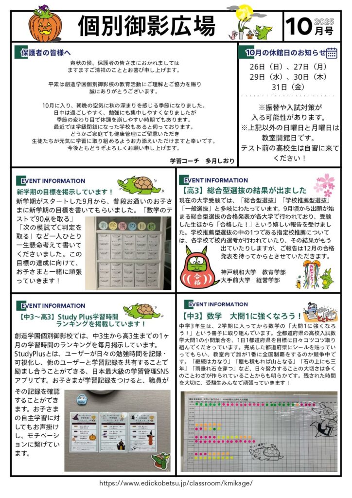 創造学園個別御影校では、毎月教室独自の個別ひろばを発行しています。