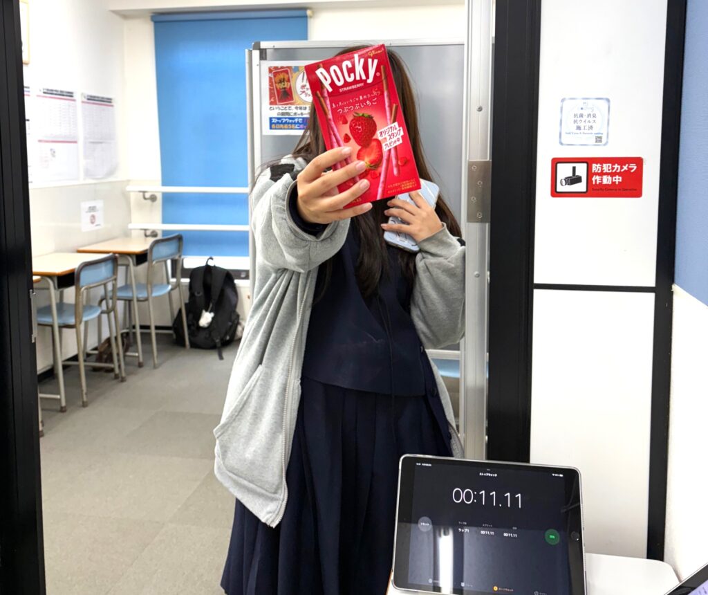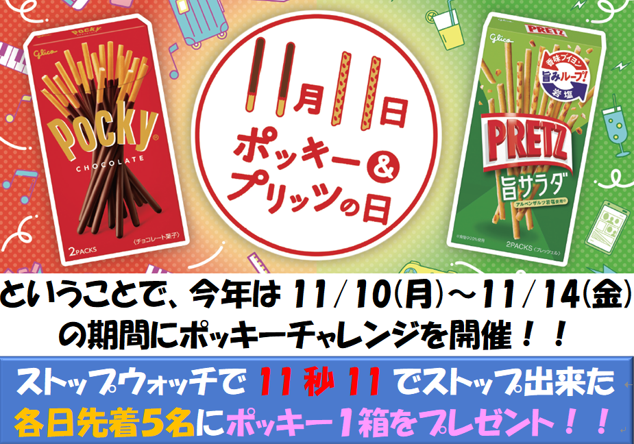 ストップウォッチで「11秒11」をピタリと出せたら、ポッキー1箱プレゼント🎁!