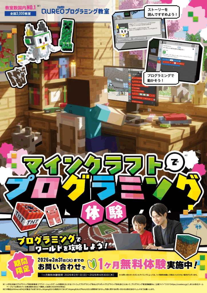 2026年春、お子様の新しい習い事に「プログラミング」はいかがですか? 現在、QUREO(キュレオ)プログラミング教室では、期間限定で「1ヶ月無料体験」の申し込みを受け付けています!✨