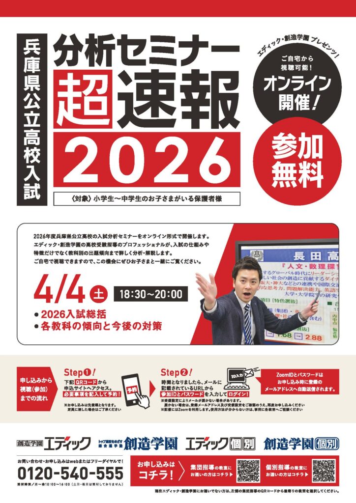 先日開催いたしました「2026年度 兵庫県公立高校入試分析セミナー超速報」には、多くの方にご参加いただき誠にありがとうございました。